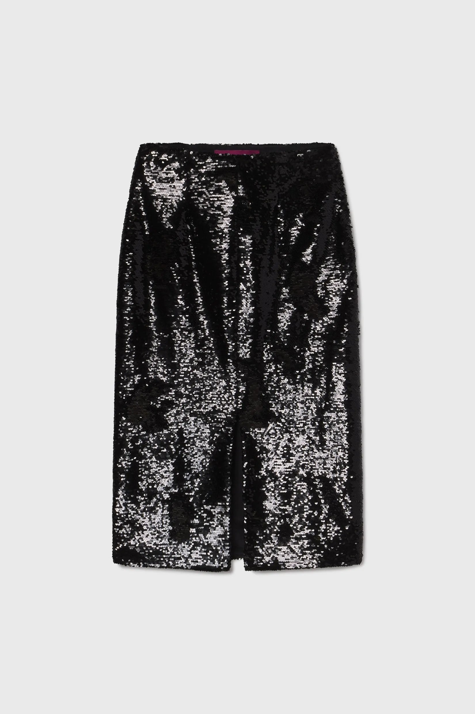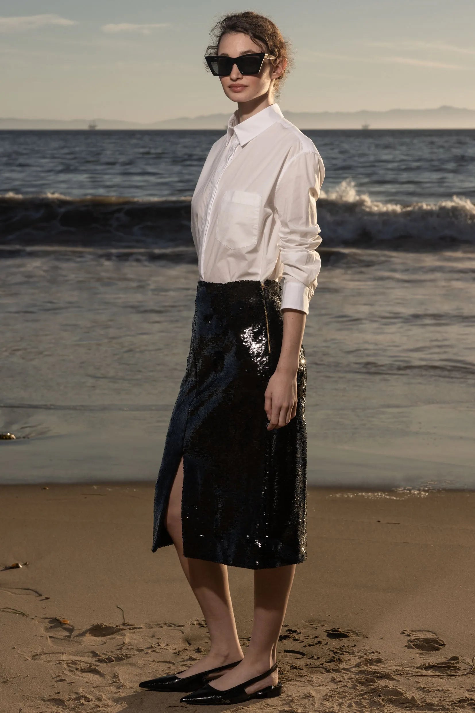 A front open slit and center front seam take our pencil silhouette Ember Skirt from classic, to show stopper. The Ember comes in two-way sequin and is begging to be worn dressed down boldly with your favorite SRF tee.  Fully lined with twill facing and a  side zipper.