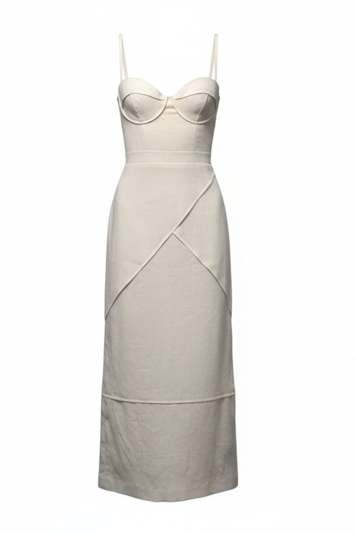 The Gia Dress is modern, composed, and quietly striking. The fitted, underwired bodice and slender straps define the figure, while the skirt, inspired by our Geometry Skirt, moves with gentle precision.