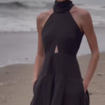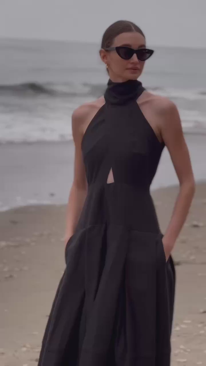 The GINGER dress is made in Los Angeles, and features a folded halter neckline and a flowing scarf collar, offering versatile elegance. The drop waist skirt is pocketed and pleated, swinging with you and with the wind. If you are short waisted, we recommend to size down. This bestseller has been restocked more times than we can count.