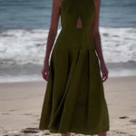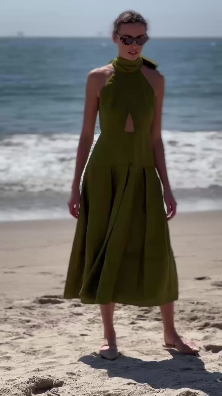 The GINGER dress is made in Los Angeles, and features a folded halter neckline and a flowing scarf collar, offering versatile elegance. The drop waist skirt is pocketed and pleated, swinging with you and with the wind. If you are short waisted, we recommend to size down. This bestseller has been restocked more times than we can count.