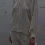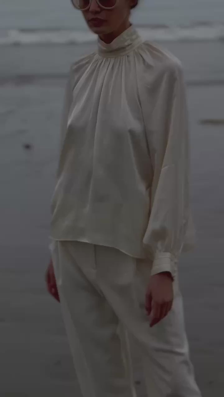 An elevated satin blouse designed for both ease and impact. The cuff and collar feature three finely pressed pleats, each finished with three loop closures and custom-covered buttons for a refined touch. Gathered through the front, back, and sleeves, it offers soft volume all around, creating a silhouette that feels both luxurious and comfortable. With its no-fuss pleats and generous shape, this is the perfect holiday top, polished enough for an evening out, yet relaxed enough to wear all night.