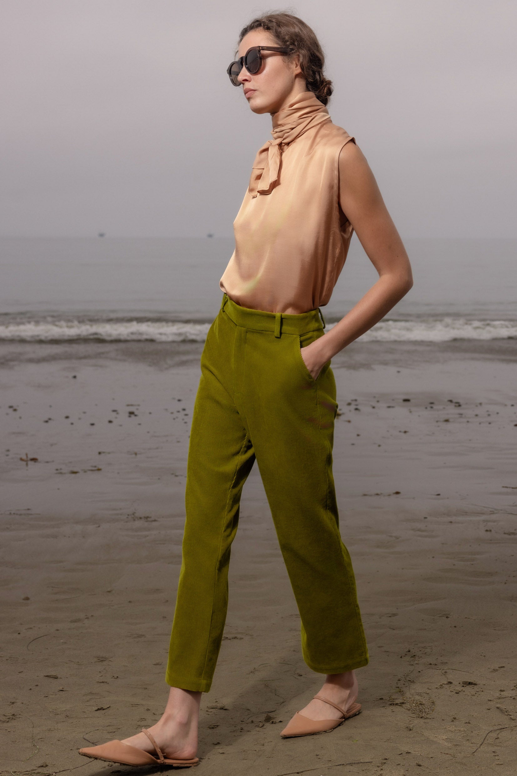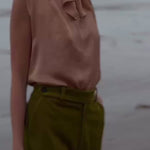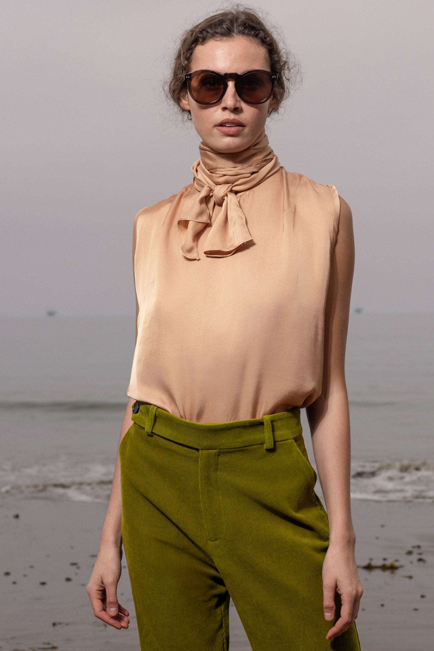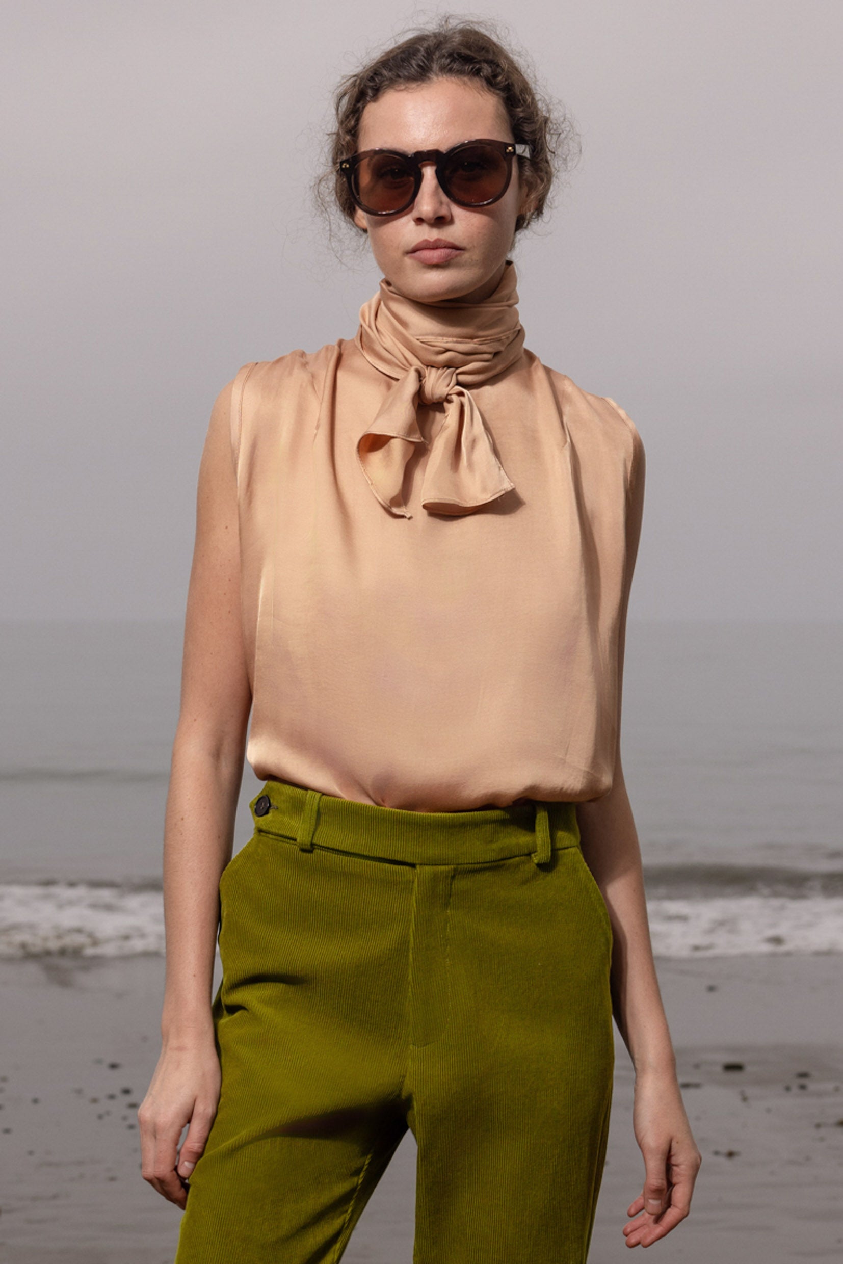 The Margo top is a study in fluidity and ease. Cut with a loose, flowing silhouette, it features a long neck tie that can be draped, bowed, or left untied to catch the breeze. Sleeveless and effortless, it shifts seamlessly from casual to statement, whether tucked into your favorite trouser or worn free for a modern, romantic feel.
