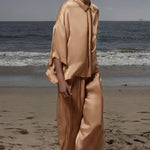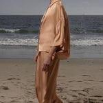 The Evening Out PJ Pant is cut in luxurious viscose satin with a soft, graceful drape. The silhouette is relaxed with long, clean lines that create a minimalist, modern shape. Contrast piping at the hem gives the pant a polished finish while maintaining the quiet ease of the design.