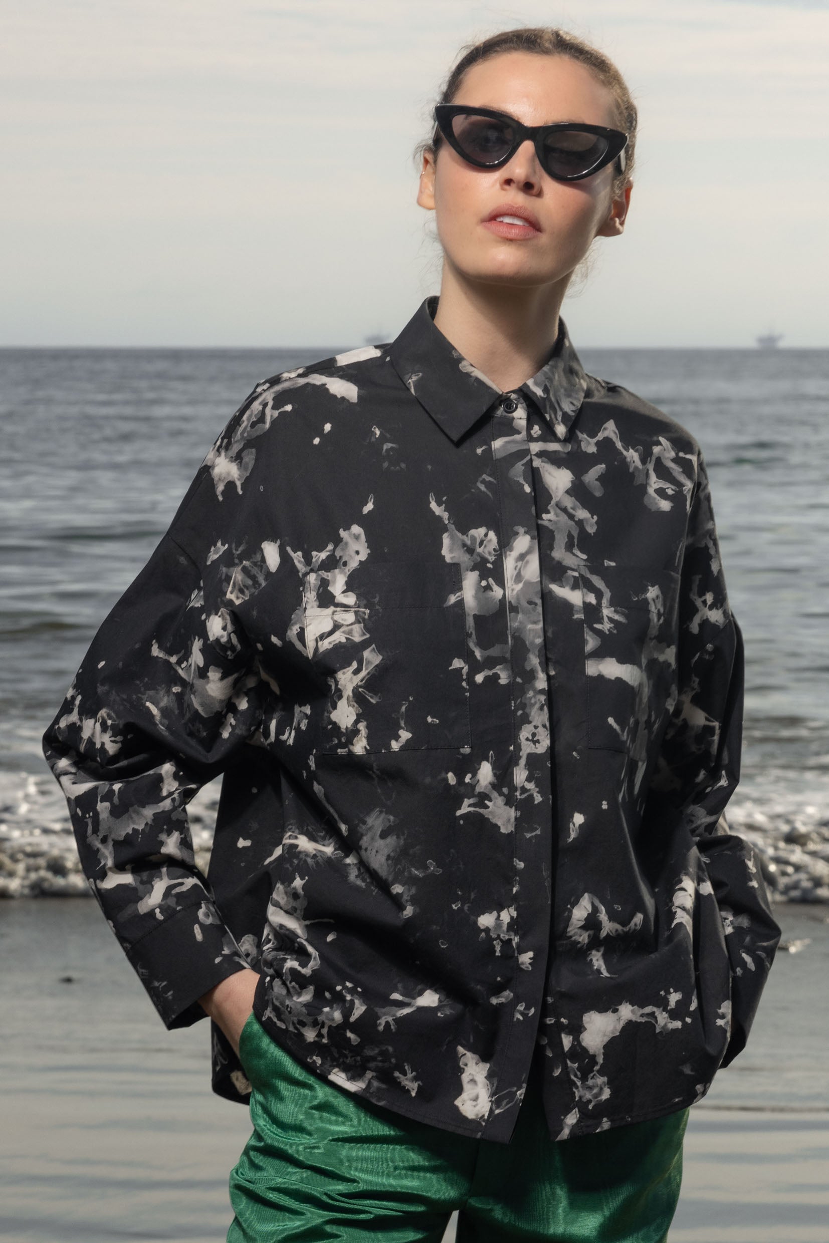 A modern take on a classic menswear silhouette, this drop shoulder collared shirt is designed with a powerful, considered presence. Clean lines define the hidden placket, while square chest pockets add balance and utility.
