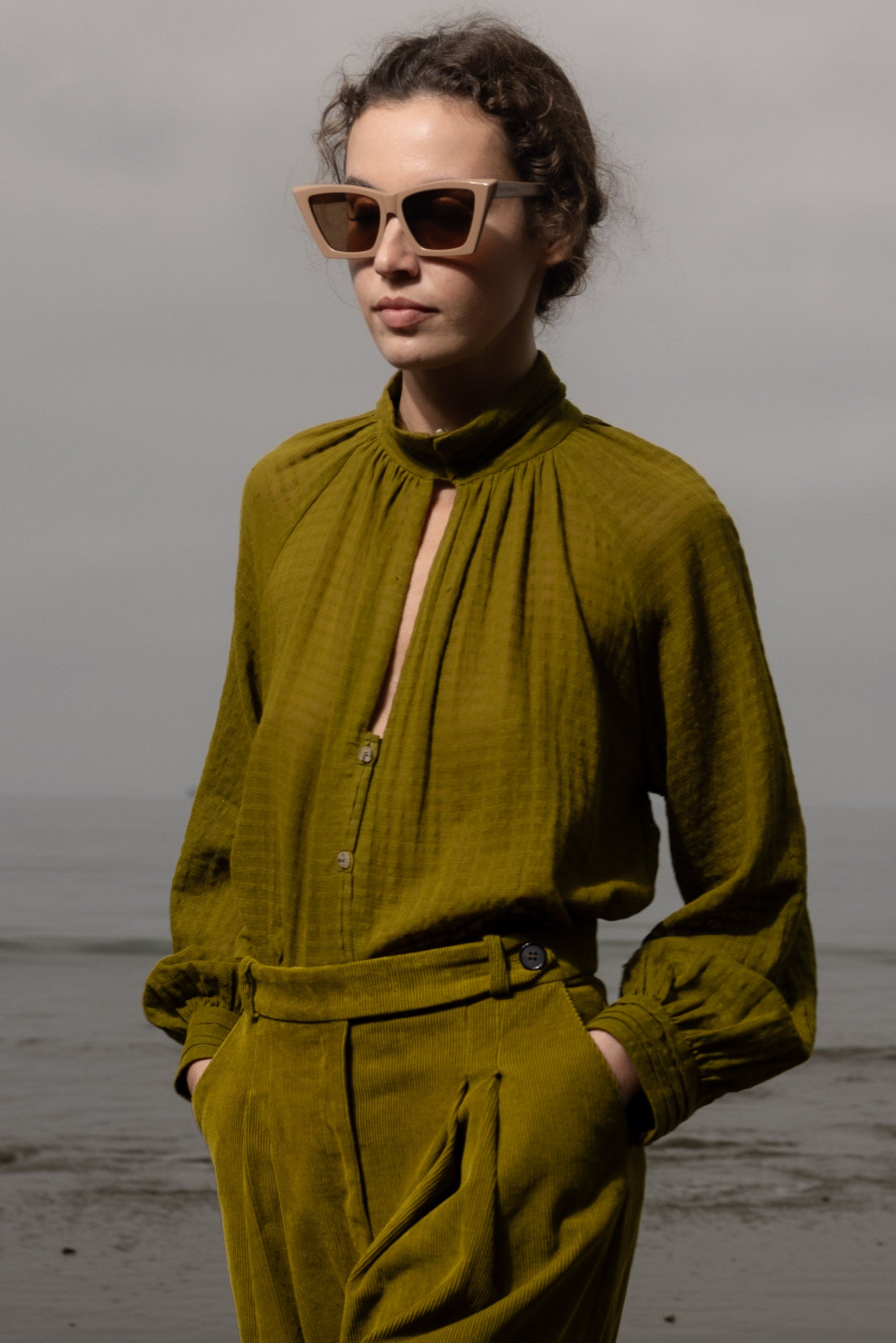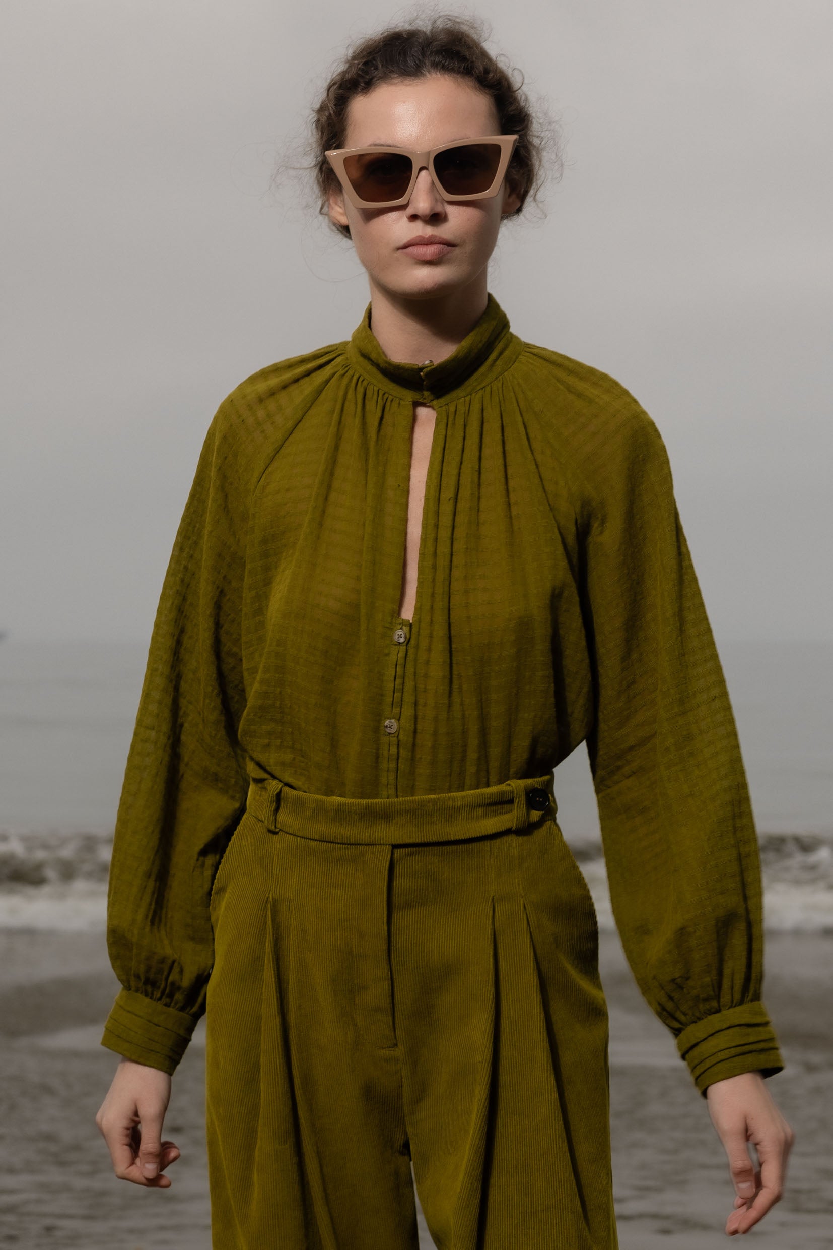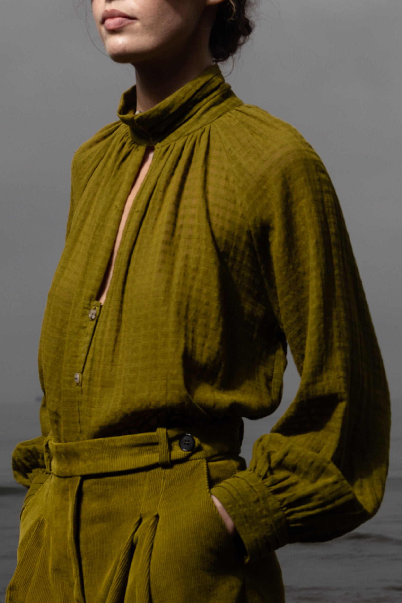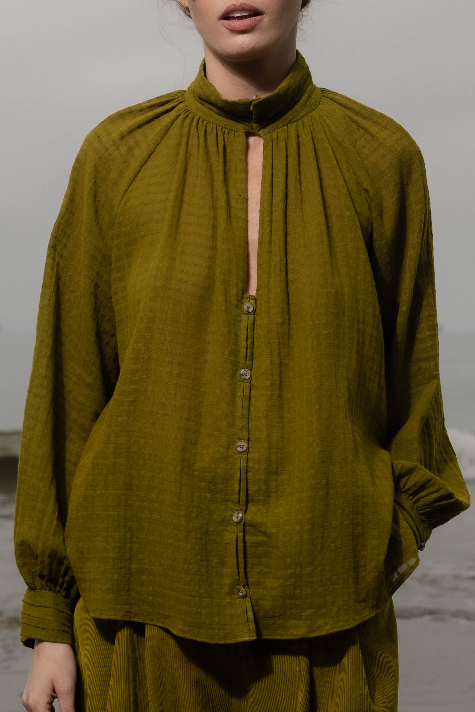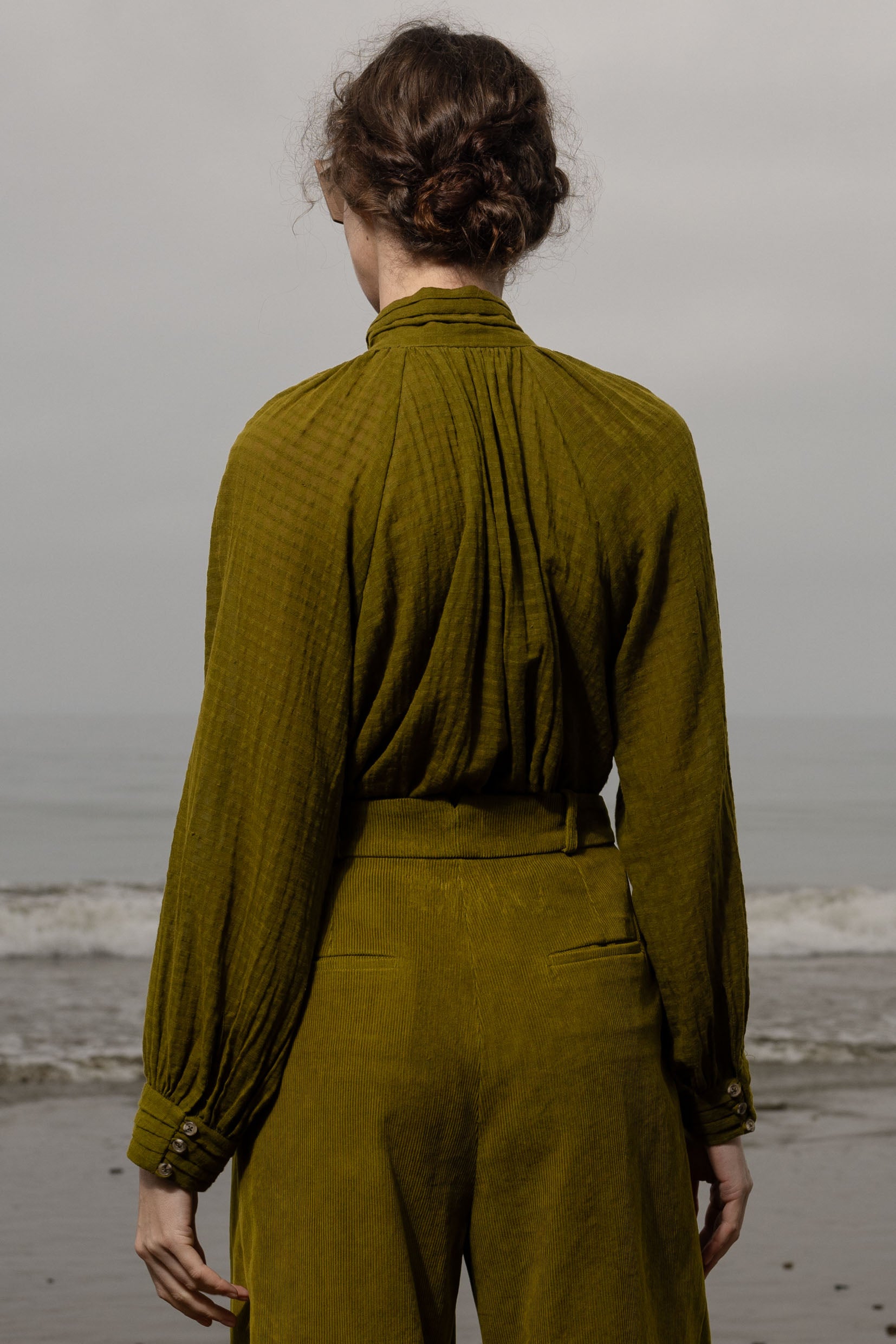 The Stallion Top is defined by thoughtful design and soft structure. It features gathered detailing at the front and back, a raglan blouson sleeve, and four pressed pleats at the collar and cuffs. Three looped buttons finish both the collar and cuffs, with a V keyhole neckline that leads into a clean, folded placket. Finished with French seams throughout, every detail is considered.