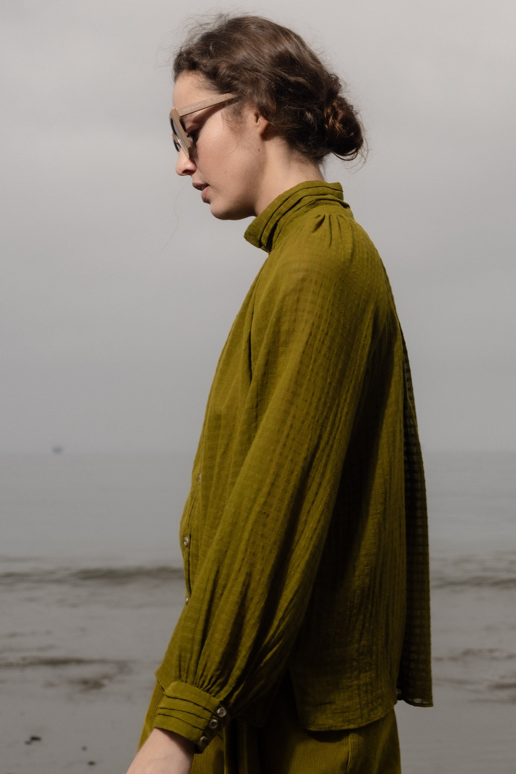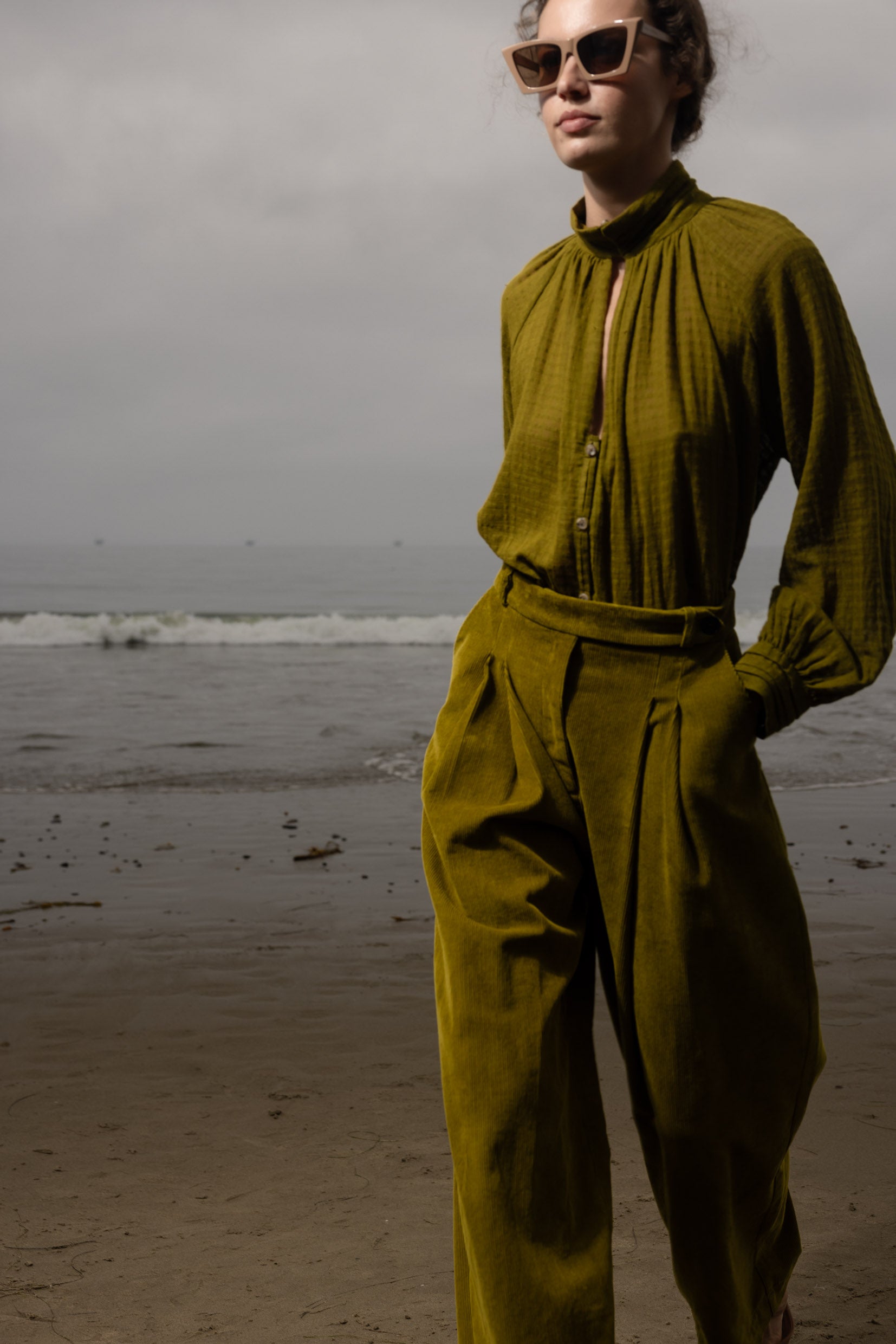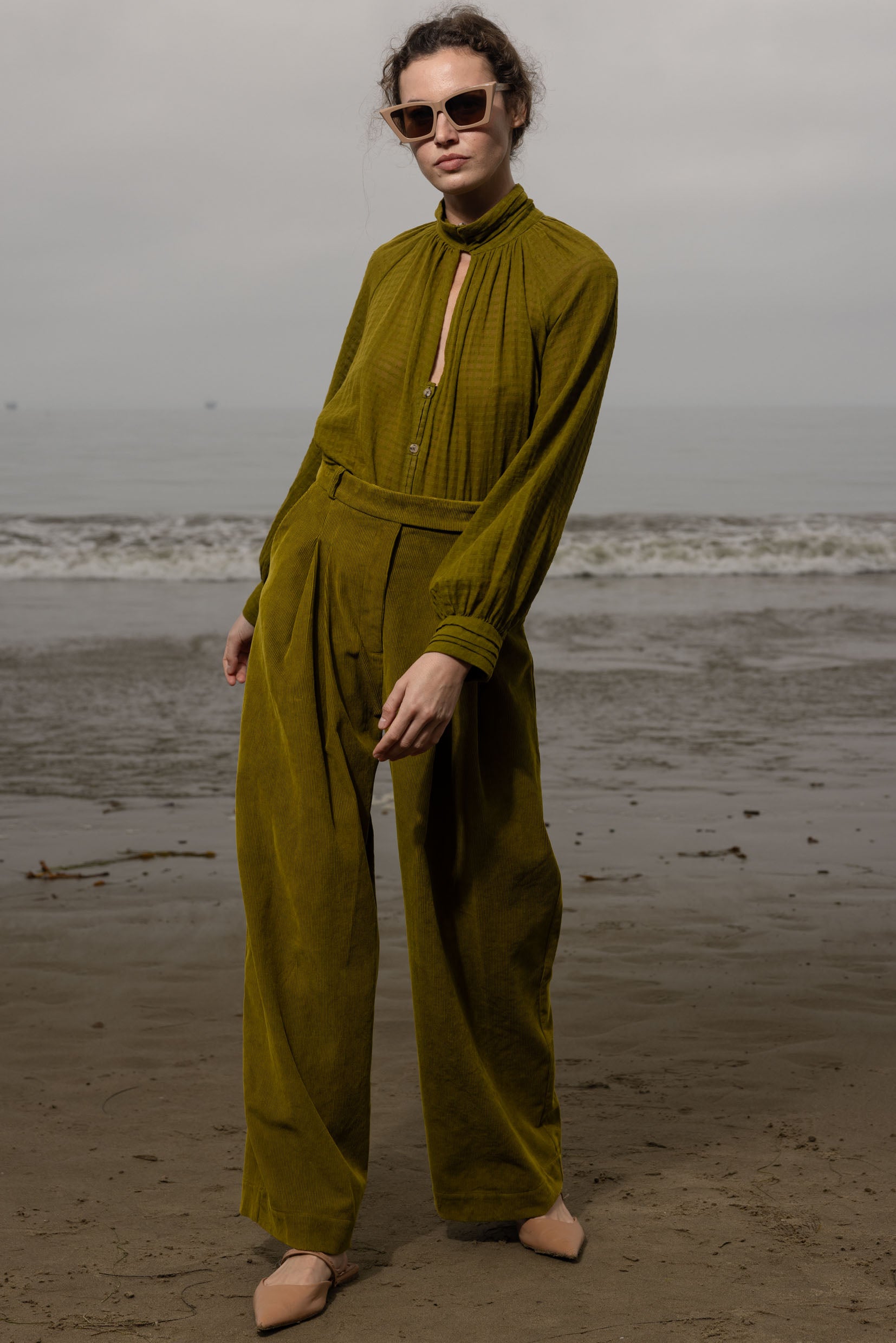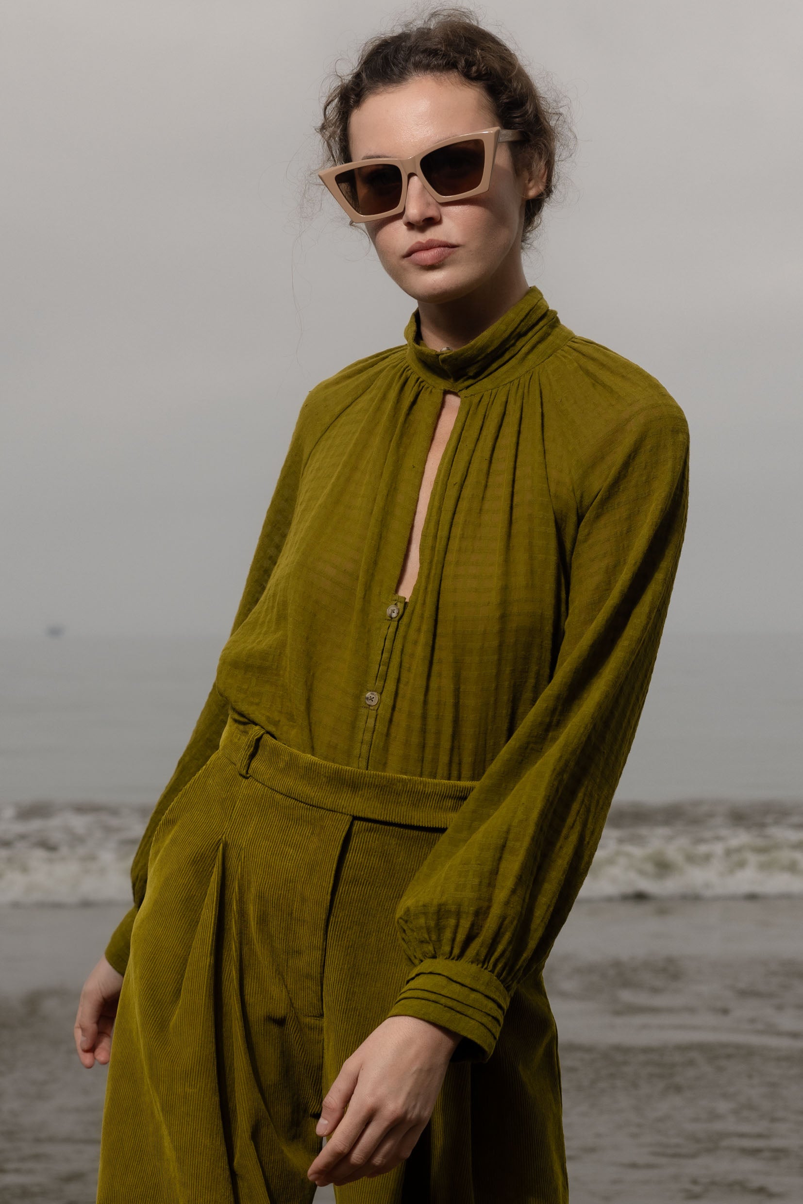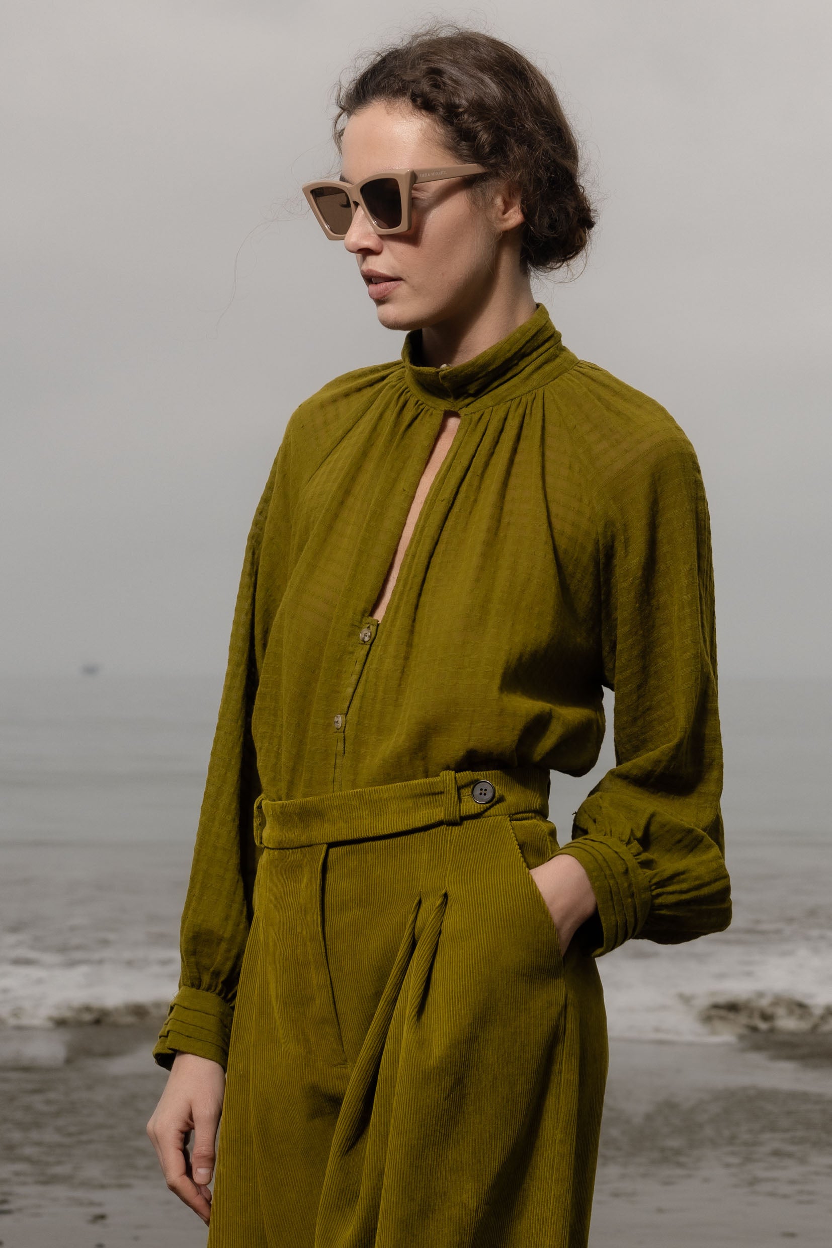 The Stallion Top is defined by thoughtful design and soft structure. It features gathered detailing at the front and back, a raglan blouson sleeve, and four pressed pleats at the collar and cuffs. Three looped buttons finish both the collar and cuffs, with a V keyhole neckline that leads into a clean, folded placket. Finished with French seams throughout, every detail is considered.