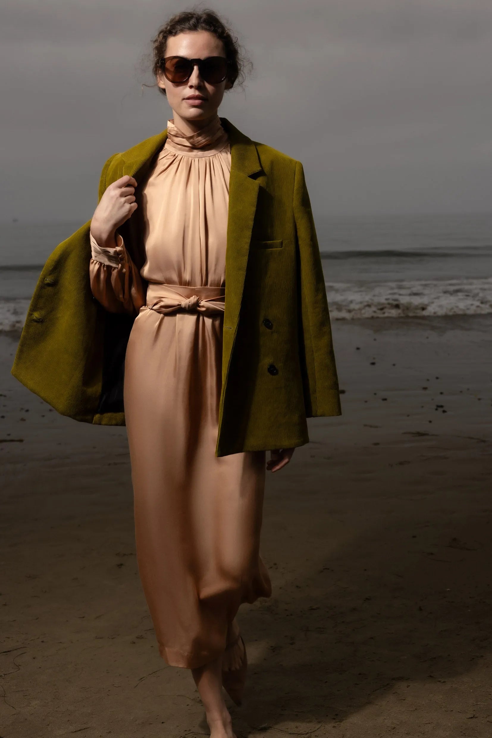 The Arnold Dress is a study in modern elegance with timeless details. Designed with volume throughout, it features delicate pressed pleats at the cuff and collar, each finished with custom covered buttons and loop closures. The gathered front, back, and sleeves create soft movement, while the matching belt allows you to define the waist as you please.
