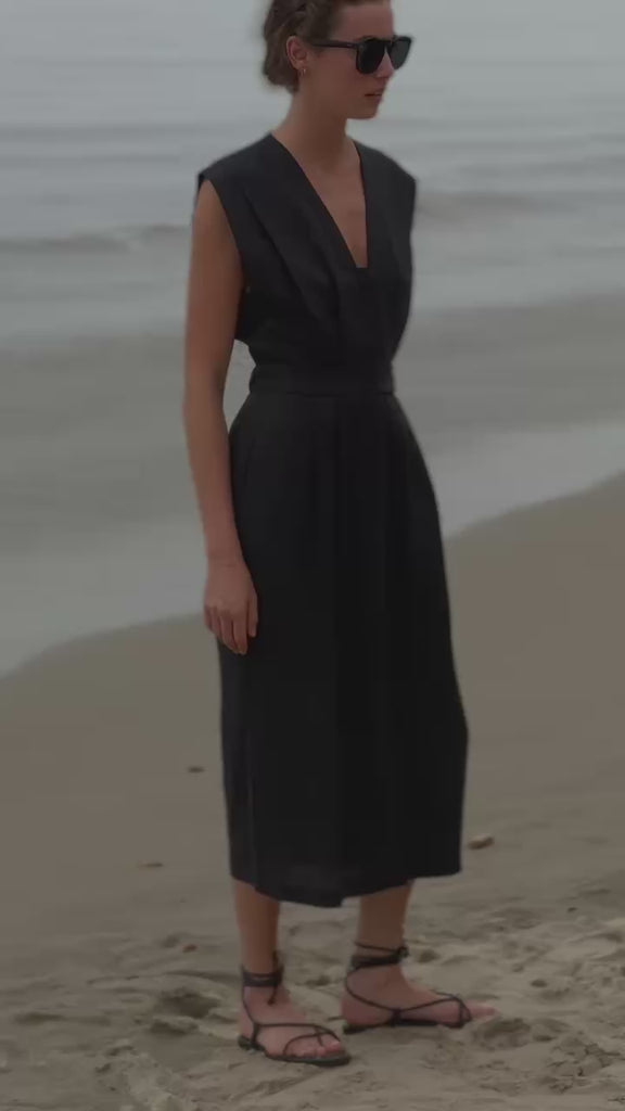 The Azadeh Dress is a refined evolution of our beloved Camille silhouette, designed to feel both powerful and undeniably feminine. Thoughtfully tailored with a soft V neckline and structured shoulder pleats, it offers a balanced sense of ease and elegance. A crossover waistband at the back, defines the waist while the elastic panel ensures a flattering, comfortable fit. Finished with a clean covered placket and practical side pockets, this is the dress you’ll reach for when you want to feel strong, graceful, and perfectly put together.