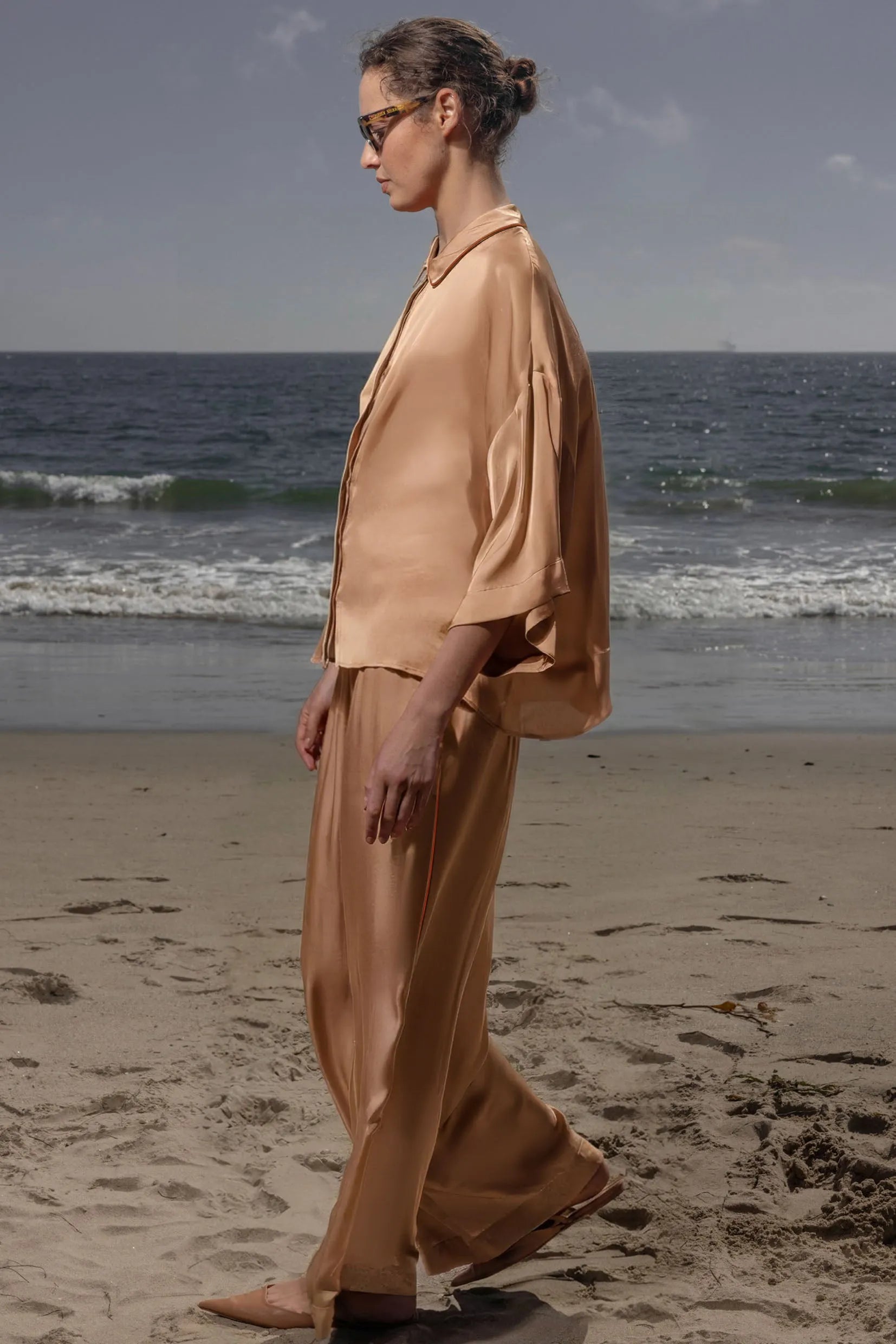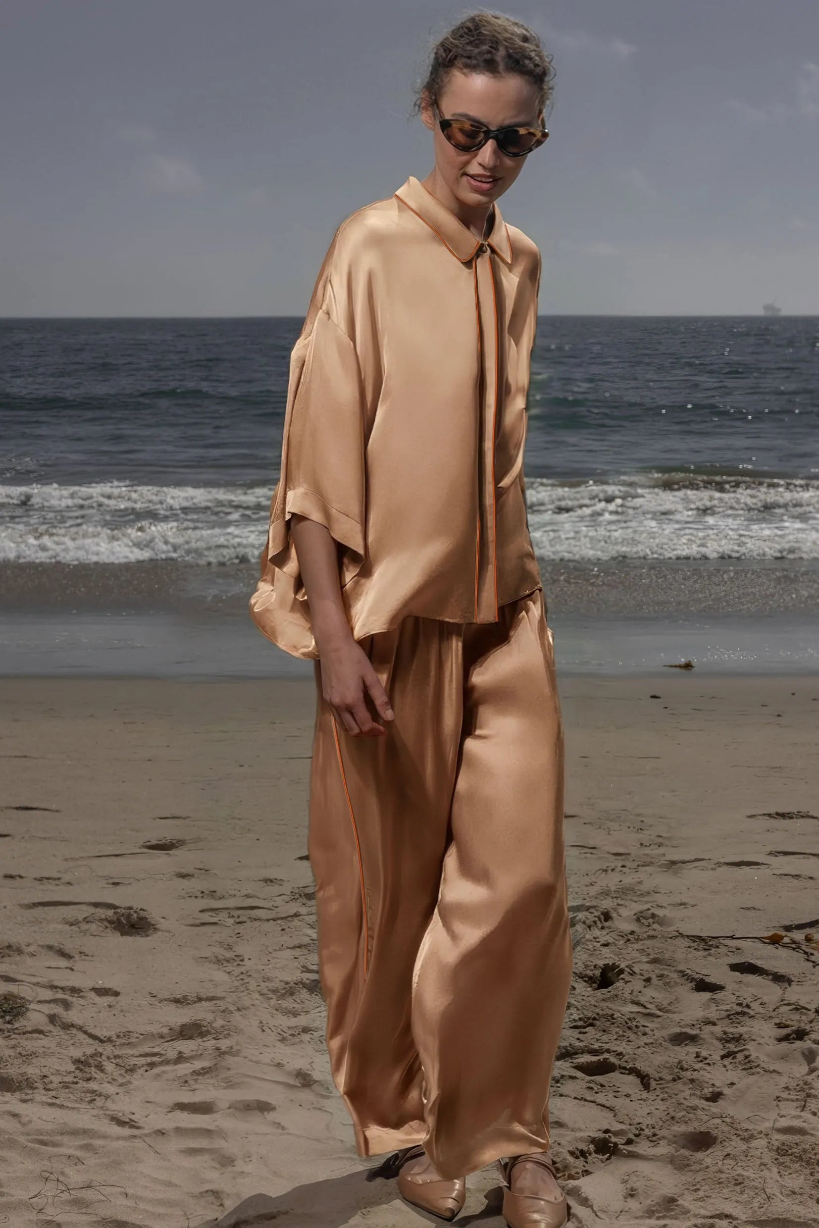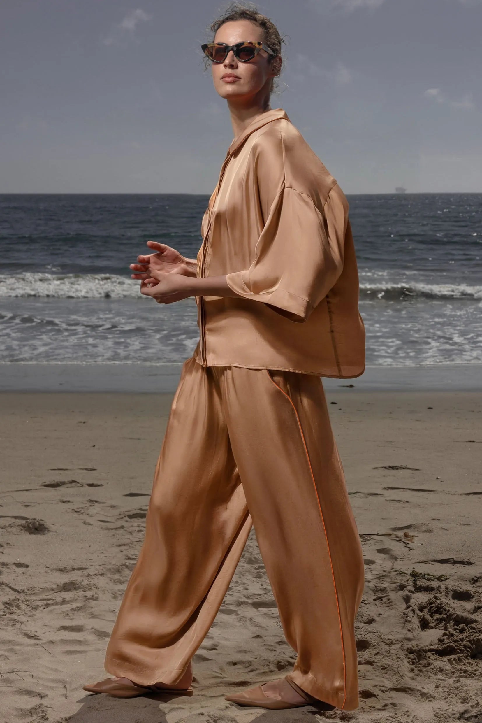 The Evening Out PJ Top is a modern, minimalist take on classic sleepwear, designed in fluid viscose satin that catches the light beautifully. The silhouette is intentionally boxy with clean lines, creating a refined balance between structure and drape. A small shirt collar and covered placket keep the look quiet and sophisticated, while the contrast piping adds a polished touch.