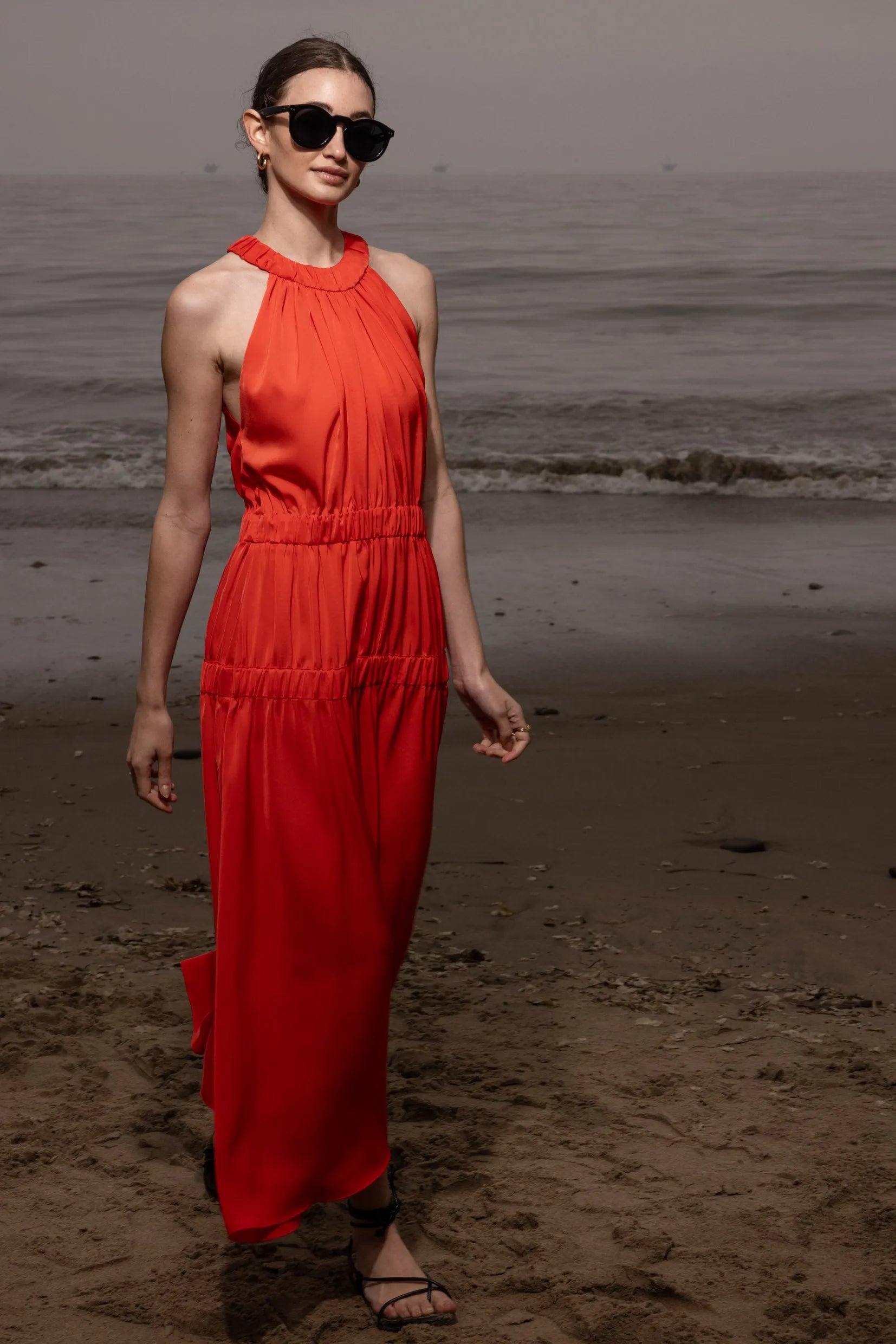 The Idyll dress offers a fresh take on elevated summer dressing. Featuring a structured, ruched collar and elegant halter neckline, it secures at the back with a delicate button-and-loop closure. Gentle gathering creates soft volume that drapes beautifully over the bust, for a flattering silhouette. Endlessly wearable, the Idyll Dress is designed to feel as beautiful as it looks.
