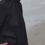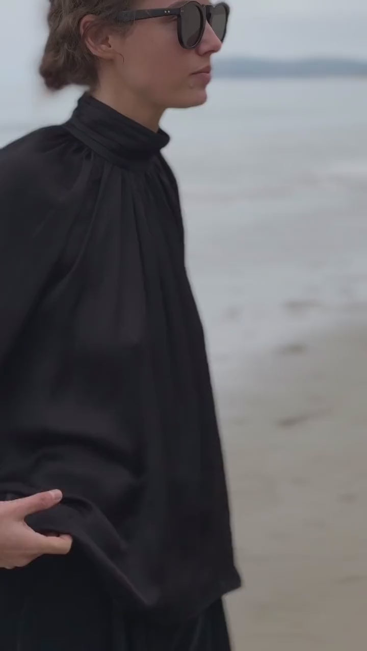 An elevated satin blouse designed for both ease and impact. The cuff and collar feature three finely pressed pleats, each finished with three loop closures and custom-covered buttons for a refined touch. Gathered through the front, back, and sleeves, it offers soft volume all around, creating a silhouette that feels both luxurious and comfortable. With its no-fuss pleats and generous shape, this is the perfect holiday top, polished enough for an evening out, yet relaxed enough to wear all night.