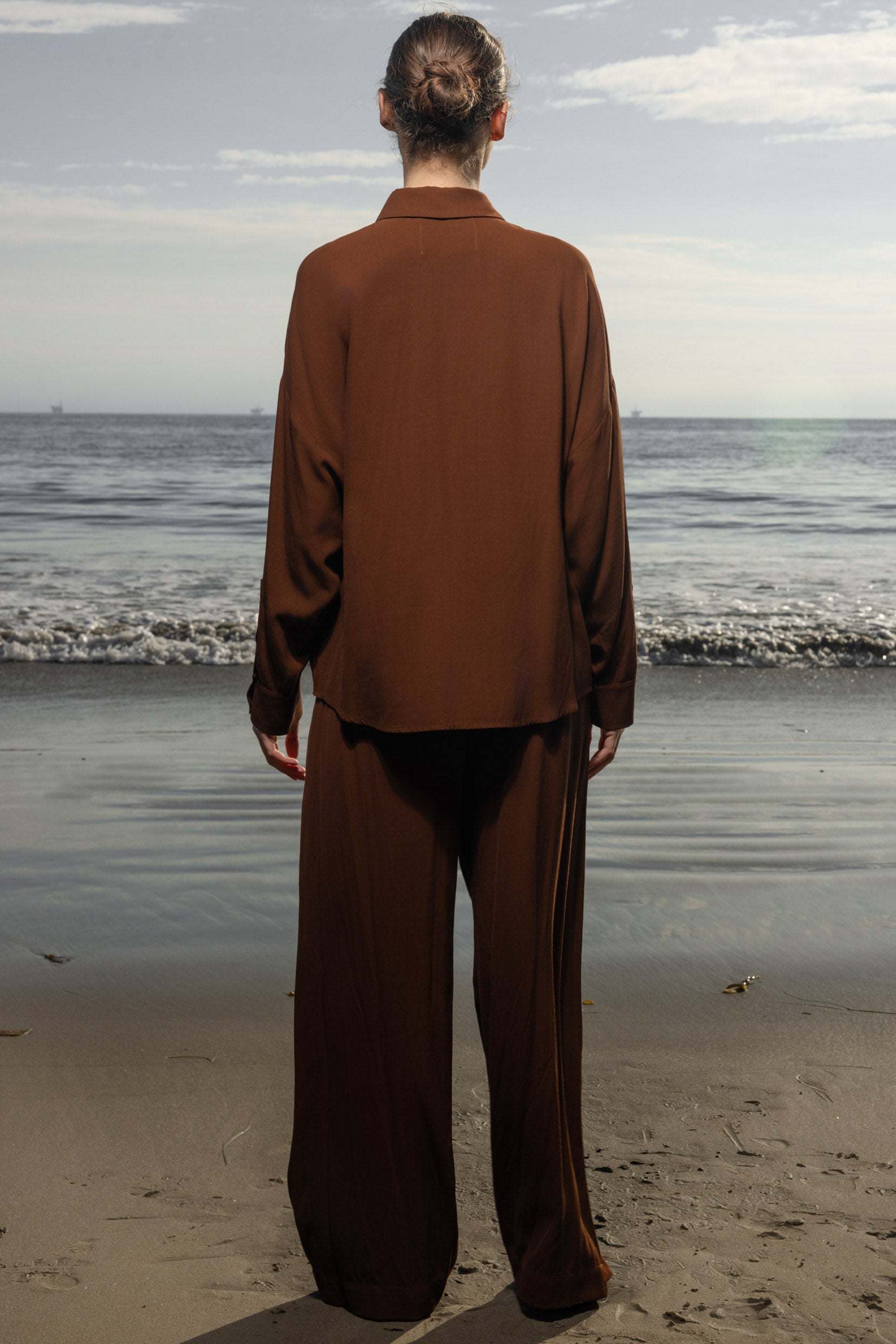 A modern take on a classic menswear silhouette, this drop shoulder collared shirt is designed with a powerful, considered presence. Clean lines define the hidden placket, while square chest pockets add balance and utility.