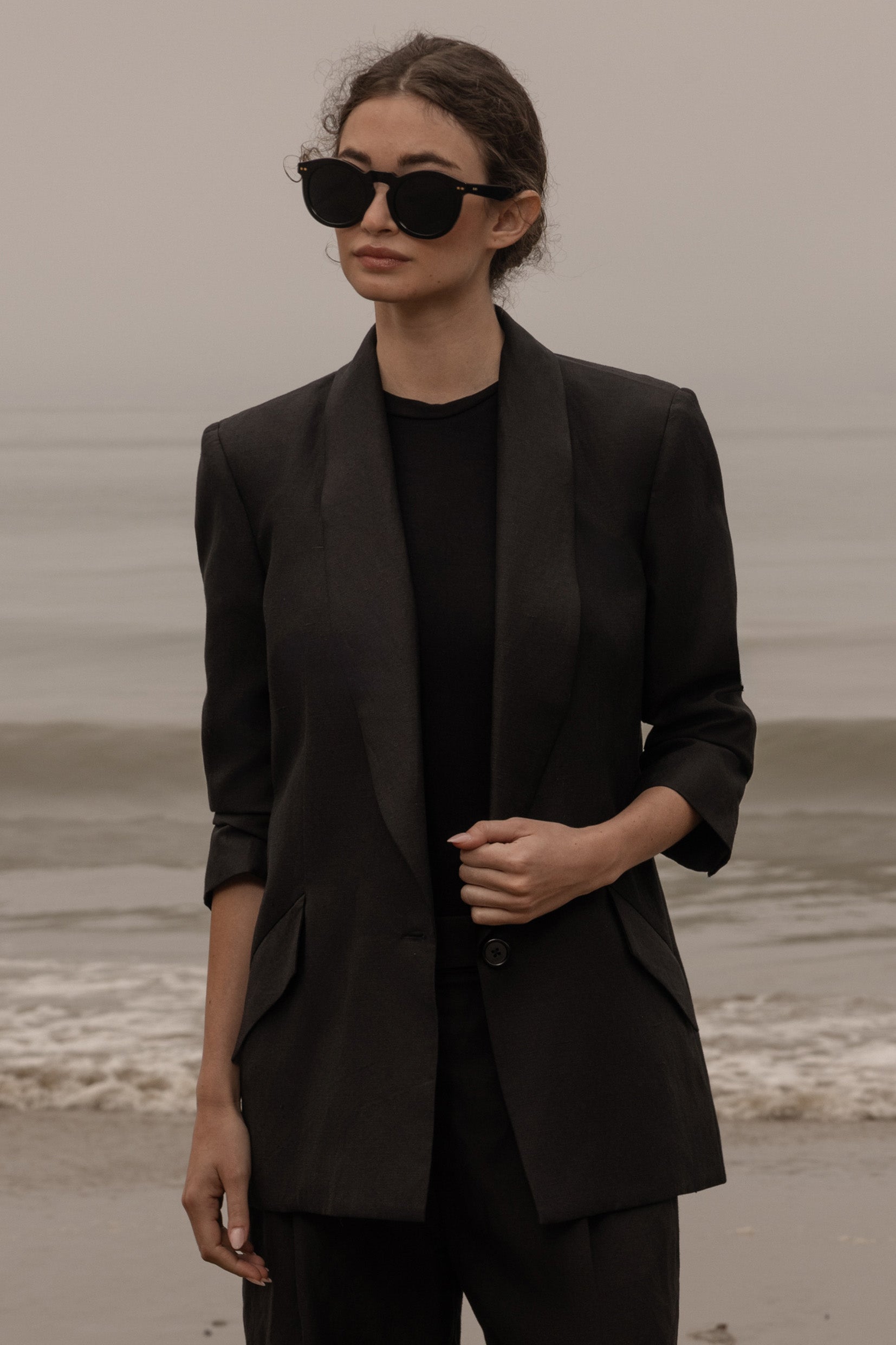 The ZELDA blazer is expertly tailored linen, fully lined, with low button that can be left open for a relaxed feel. Cut and structured shoulders contrast a long sleek body and soft rounded collar line. It is a perfect timeless blazer.