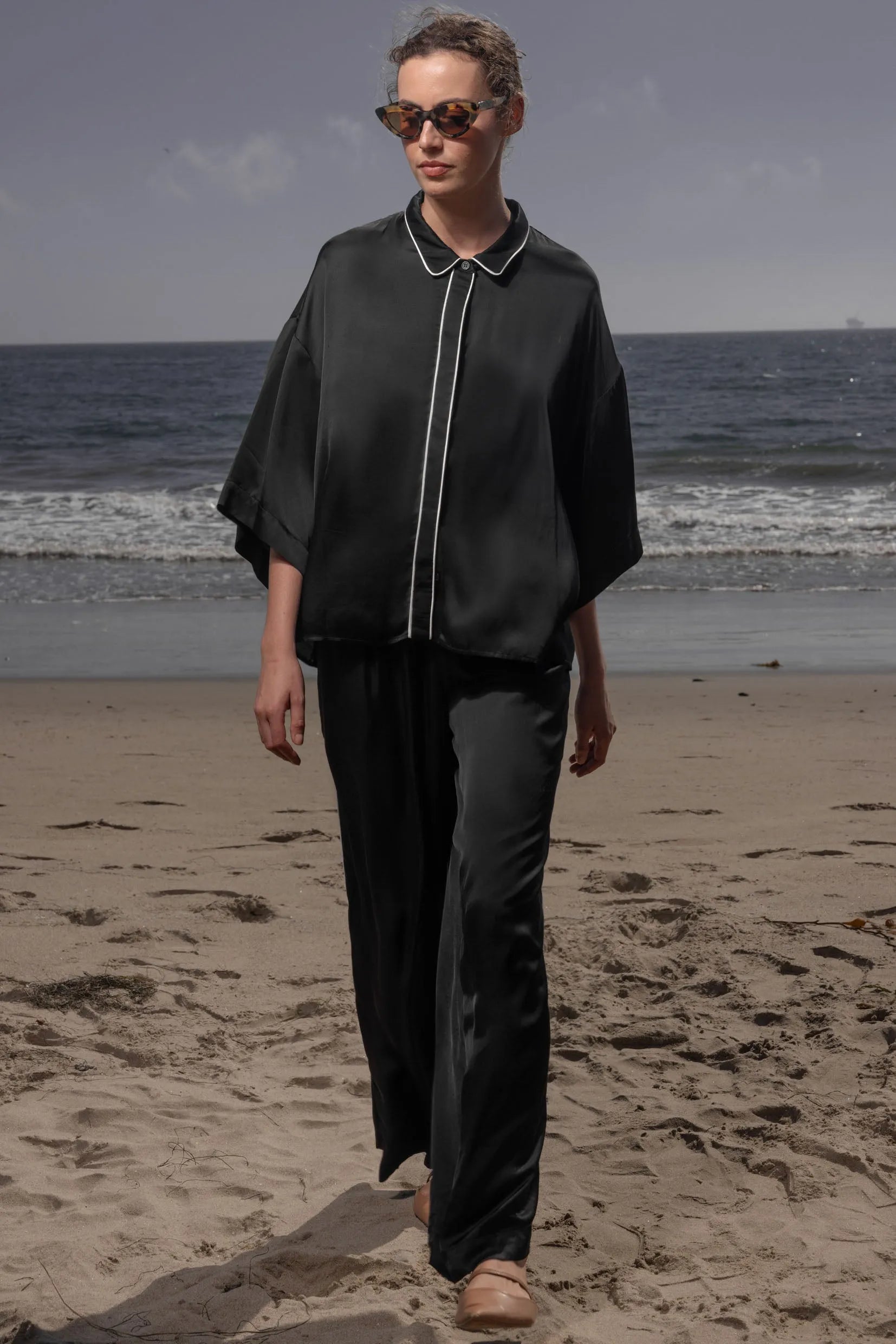 The Evening Out PJ Pant is cut in luxurious viscose satin with a soft, graceful drape. The silhouette is relaxed with long, clean lines that create a minimalist, modern shape. Contrast piping at the hem gives the pant a polished finish while maintaining the quiet ease of the design.