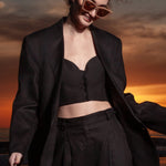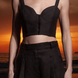 The Charlie top is a delicate yet sexy, button up front, bustier style top. With a fitted shoulder strap, sweetheart neckline, and lace up back - it is soon to be your favorite crop. This refined silhouette is made to pair with our Chaplin Pant and Wallace Blazer for the ultimate linen suit.